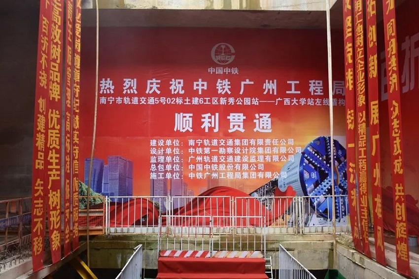 6月2日,南寧地鐵5號線新秀公園站—廣西大學站區(qū)間(以下簡稱“新廣區(qū)間”)中鐵裝備110號盾構機安全到達鋼套筒內,實現雙線貫通!圓滿完成國內首例大角度小半徑穿越富水圓礫地層運營線任務!為南寧地鐵5號線全線隧道貫通奠定了堅實基礎,打響了“抗疫情,保增長,大干100天”專項勞動競賽第一炮!